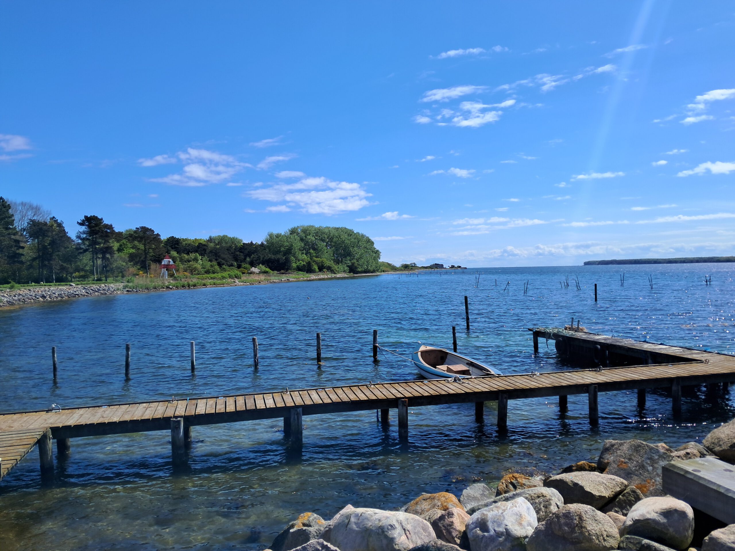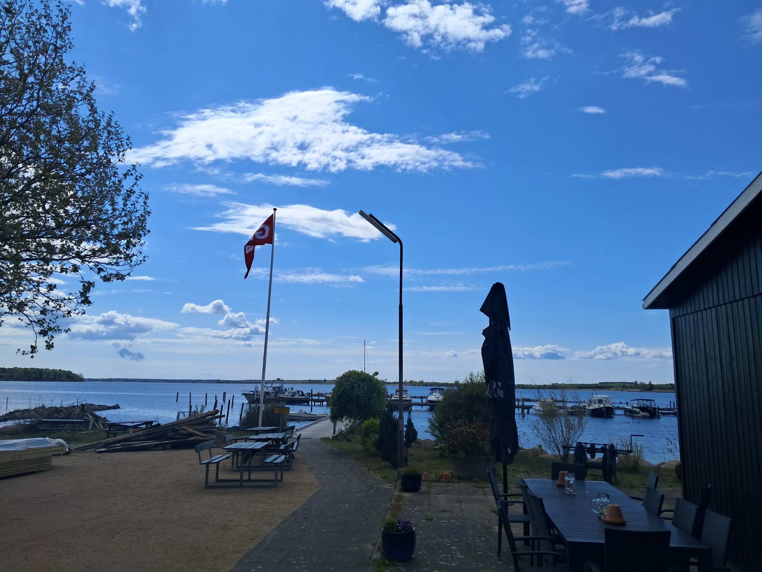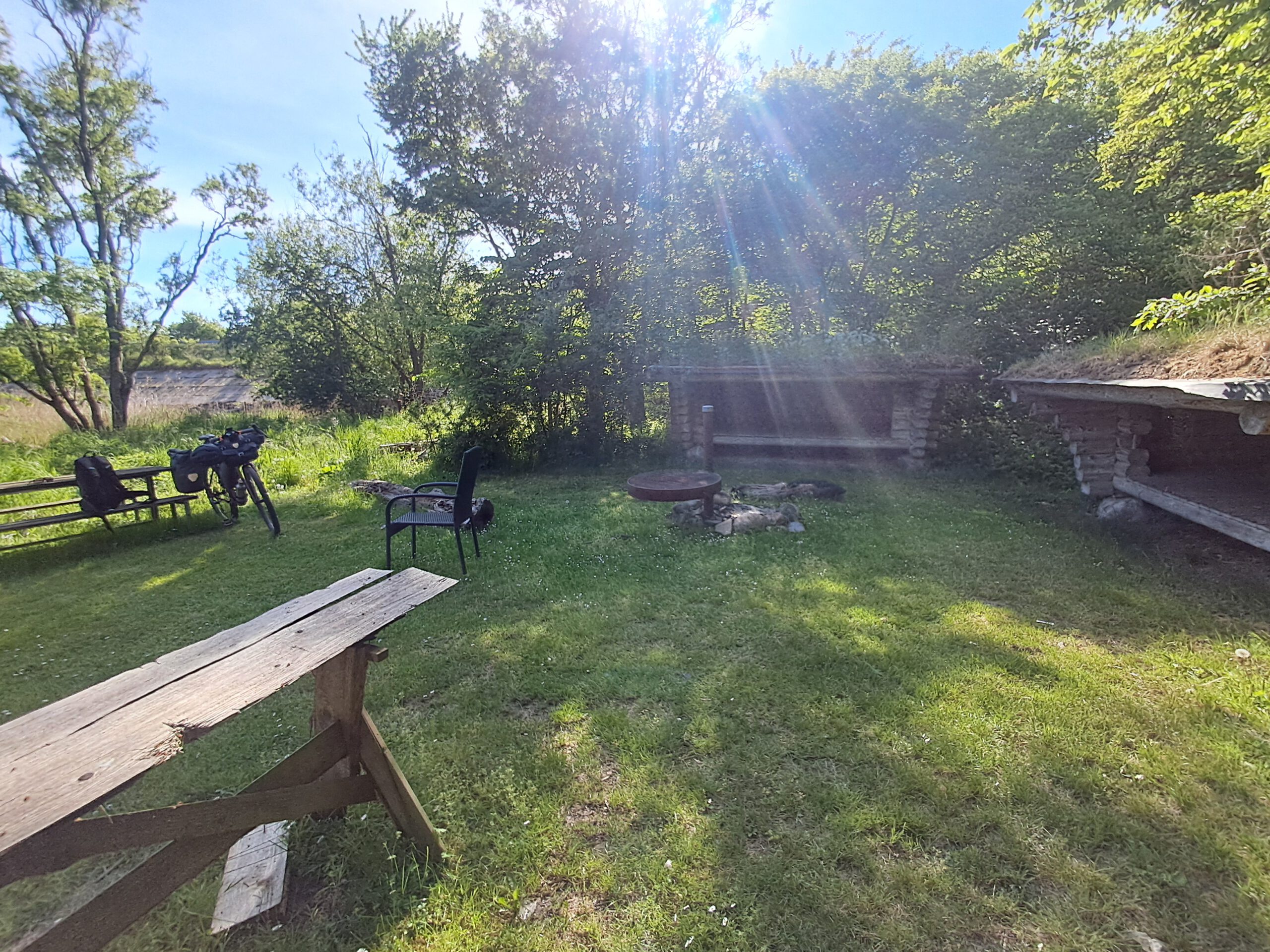 Ich nutzte die Zeit, machte mich mit der Shelter-App vertraut und steuerte schließlich mein eigenes Ziel an: Kalvehave. Der Platz lag direkt am Wasser, ausgestattet mit Sitzmöglichkeiten, einem Tisch und zwei Schutzhütten. Ein ruhiger Ort, der sofort zum Ankommen einlud.
